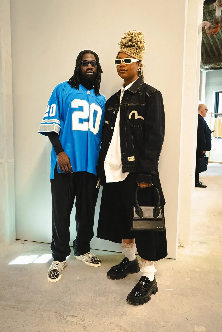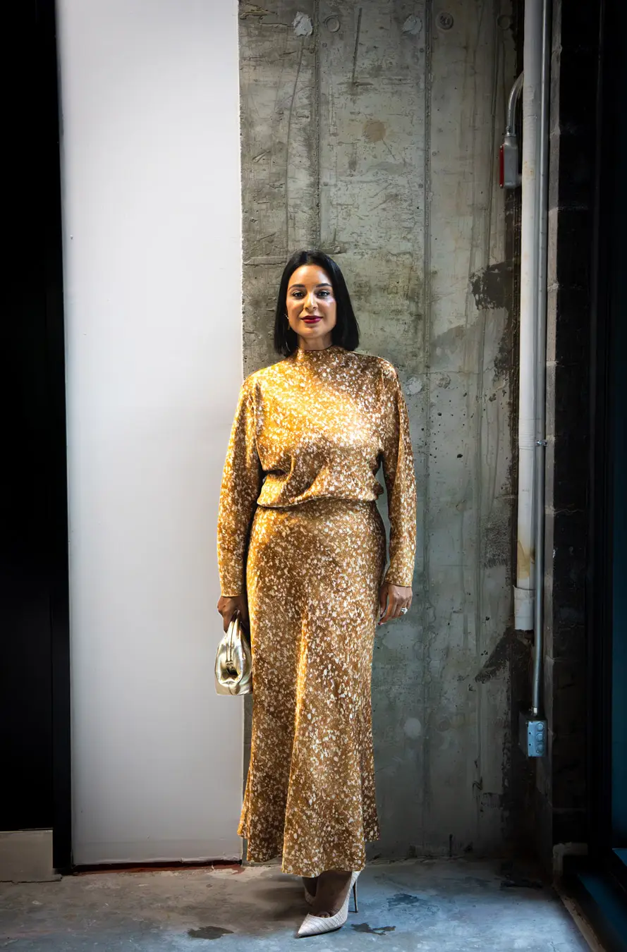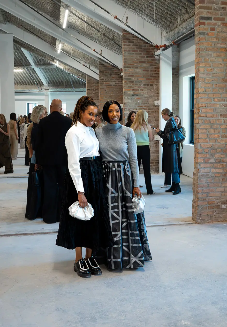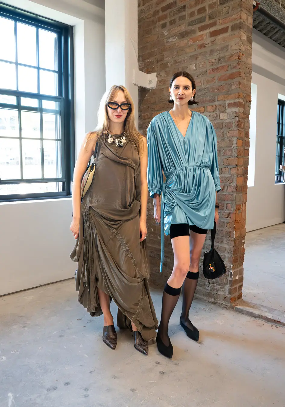 …Emily Smith offered both the tailored blazers, knits and pants she’s famous for, in black, white, cerulean blue and a luscious avocado – and long sleeved suoer long dresses, festooned with much fringe and embellishments. Guests were gawking at the fabrics – including L148-suited up the natty SNL star Heidi Gardner (all in white) and Beanie Feldstein in all black.