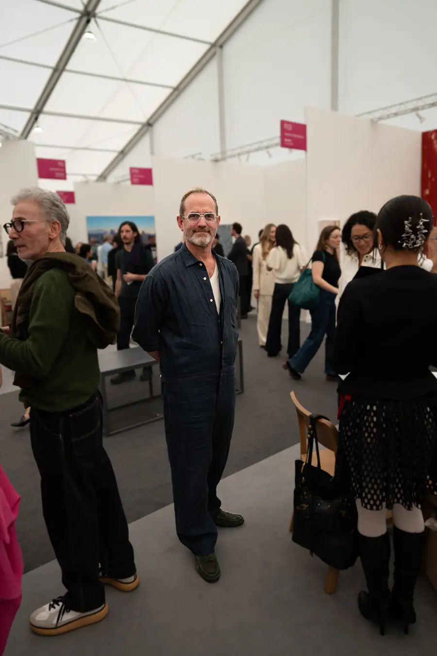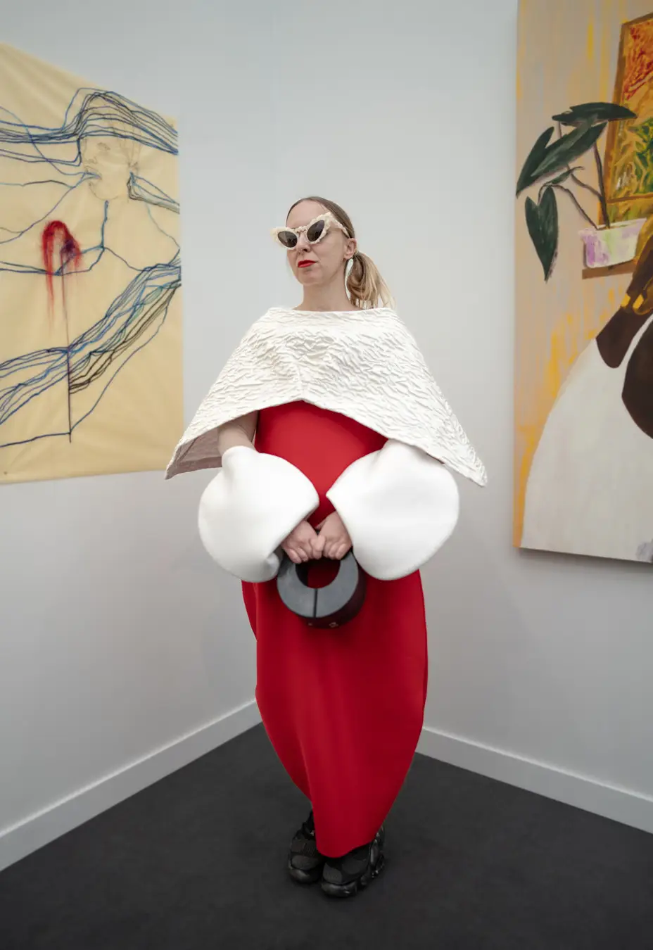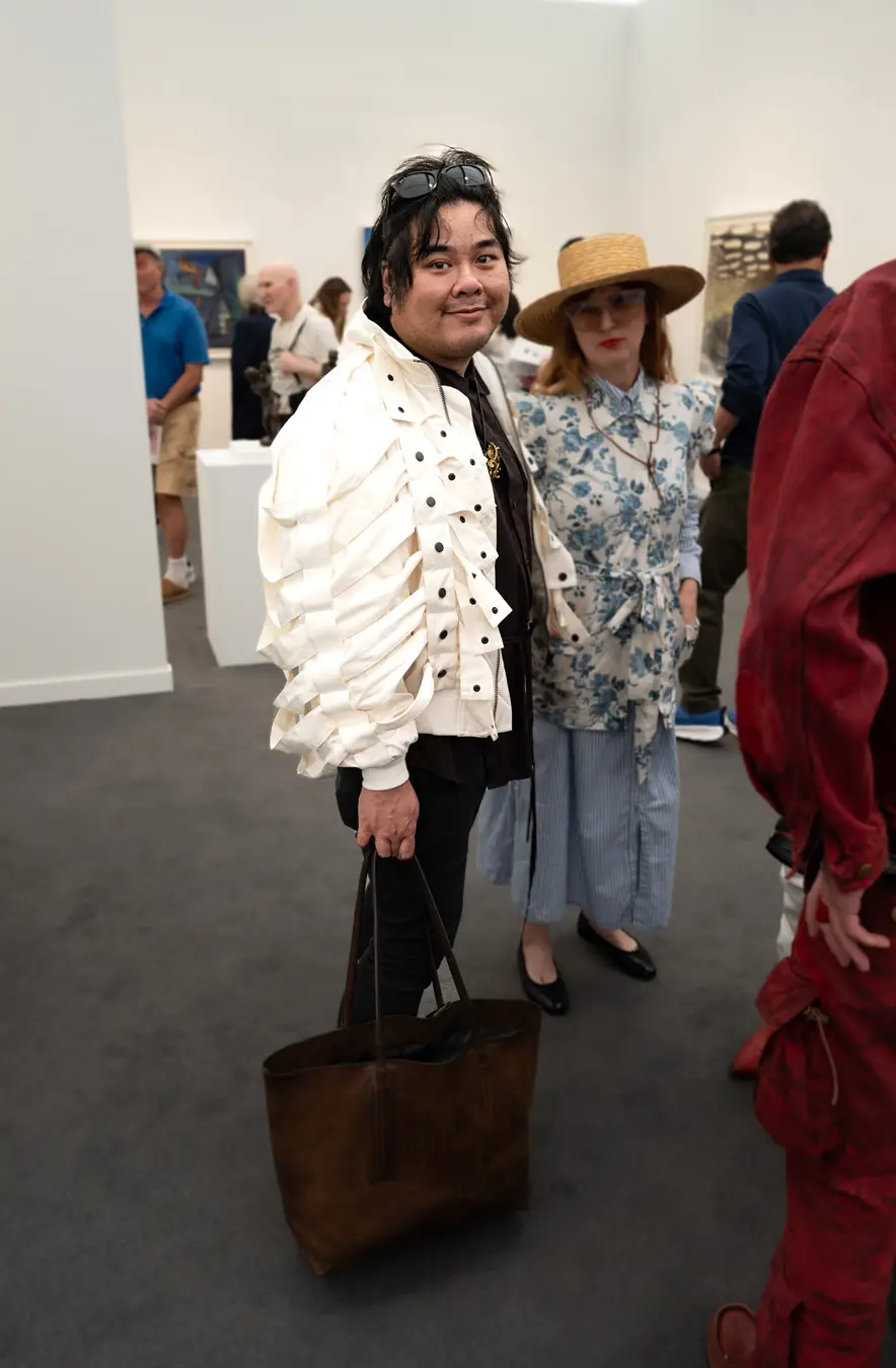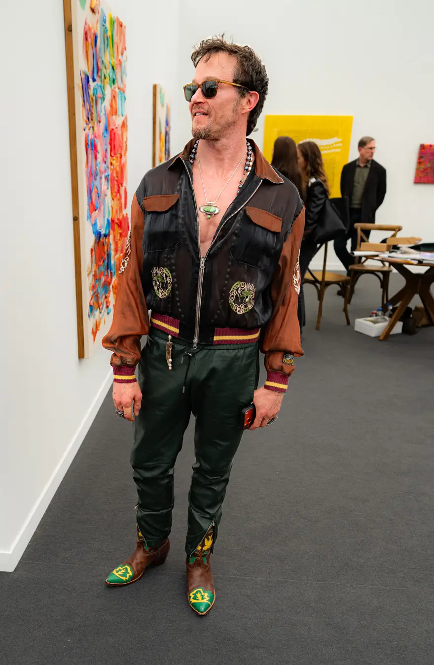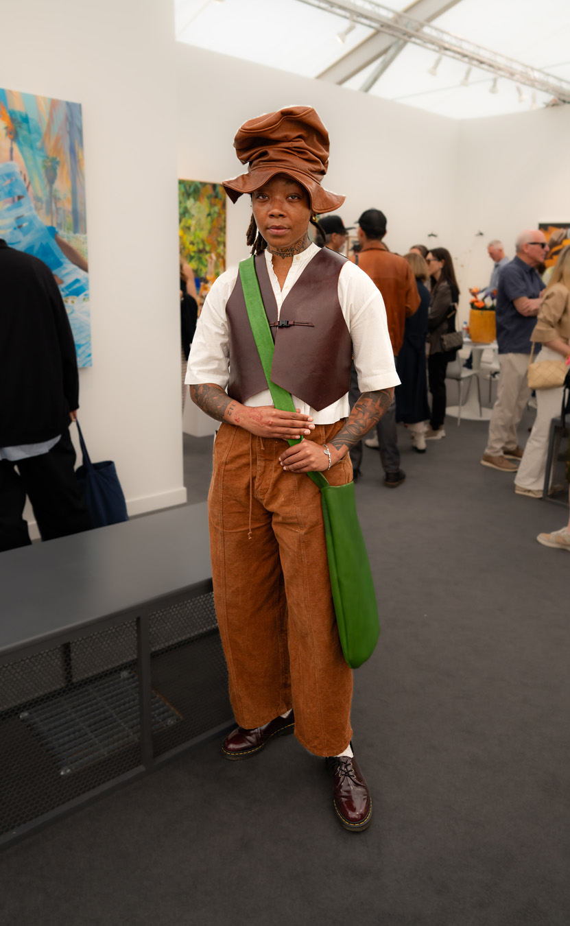 The Culture club that attends the annual Frieze L.A. art fair is not one of shrinking art school dropouts. This whimsical group treats its wardrobes as emotional aesthetic armor: there’s little conformity, fabulous eyewear, and in many cases, looks by obscure designer/artist crossover brands. Edgy is the code of the day – standing out enough to fit into the “I am my own art object” club. Takes one to know one.