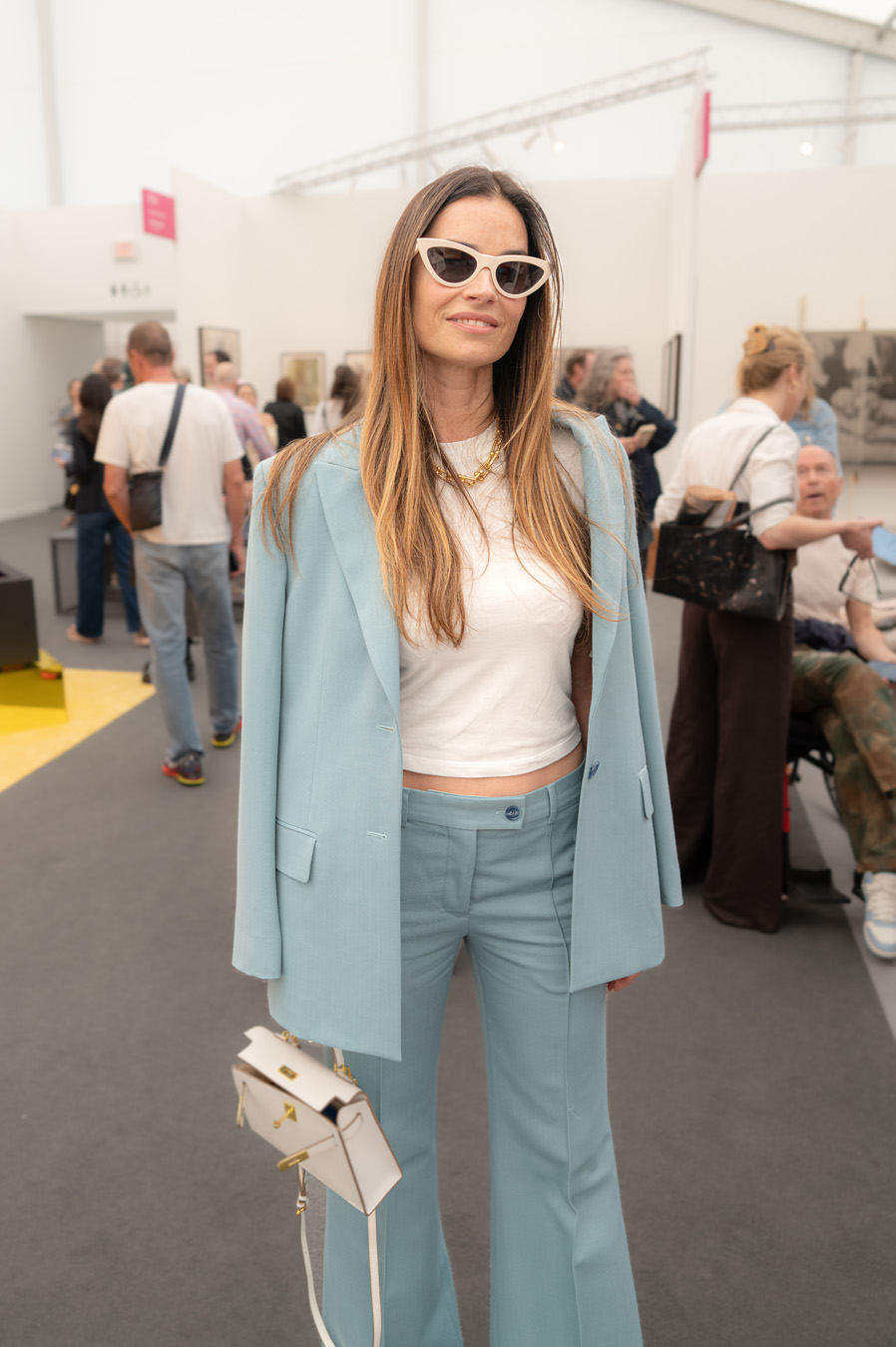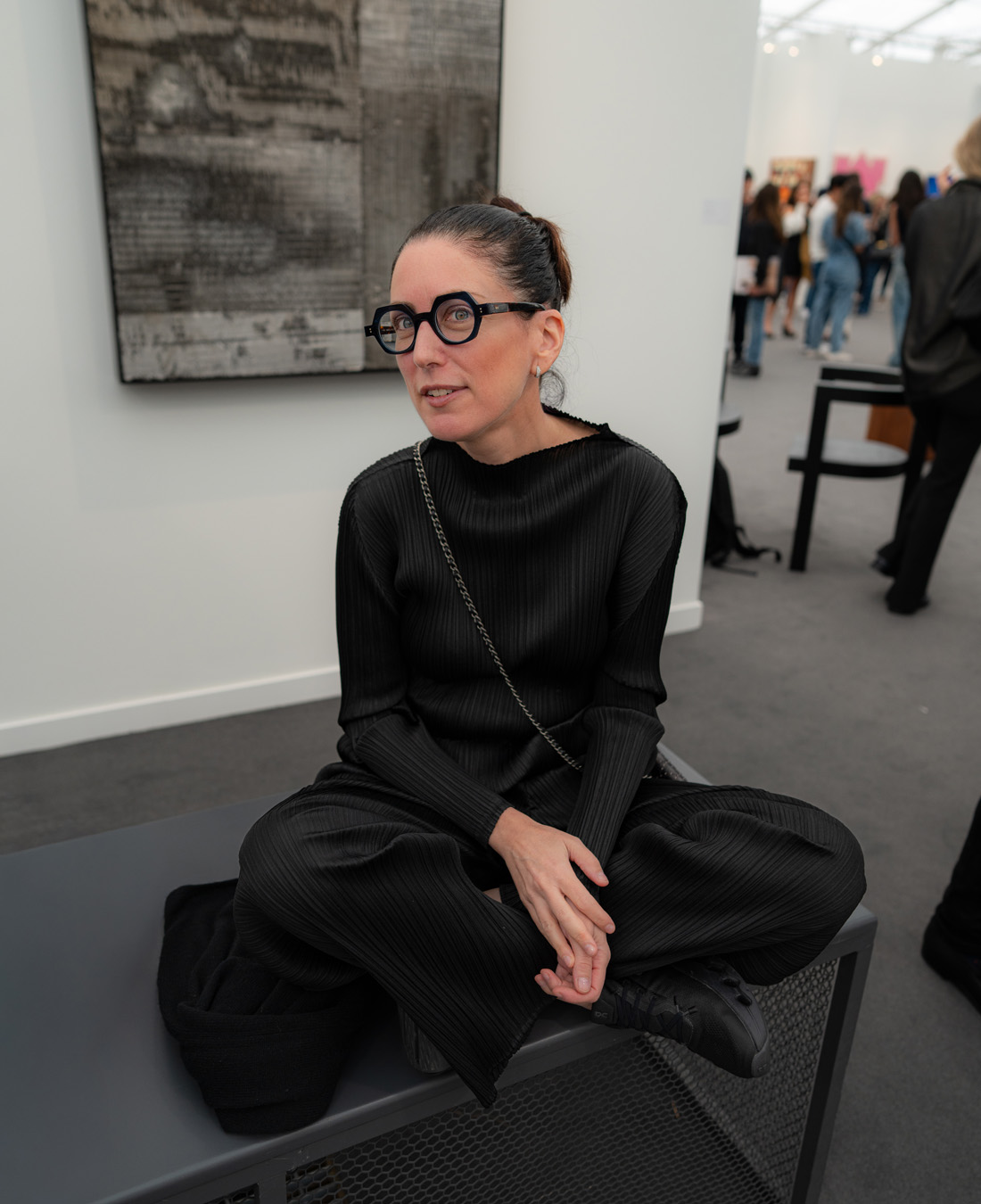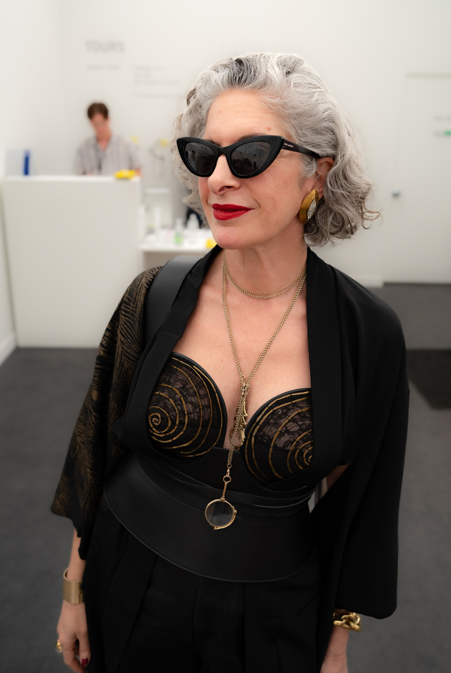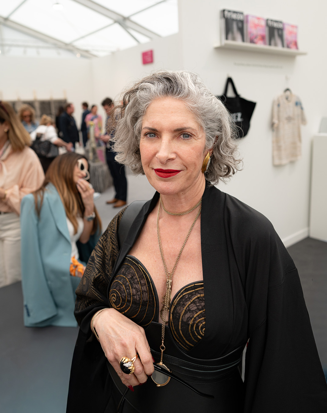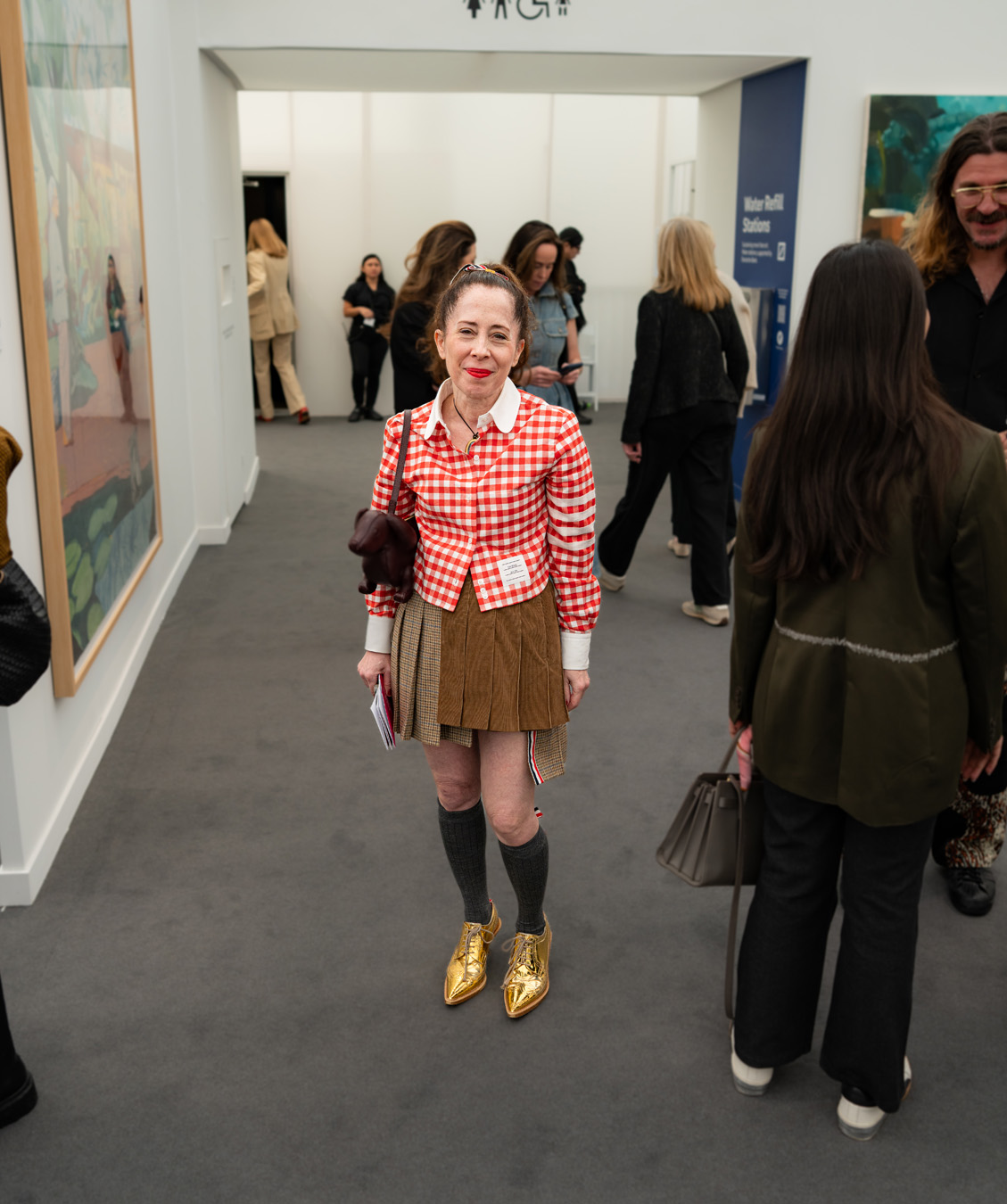The Culture club that attends the annual Frieze L.A. art fair is not one of shrinking art school dropouts. This whimsical group treats its wardrobes as emotional aesthetic armor: there’s little conformity, fabulous eyewear, and in many cases, looks by obscure designer/artist crossover brands. Edgy is the code of the day – standing out enough to fit into the “I am my own art object” club. Takes one to know one.